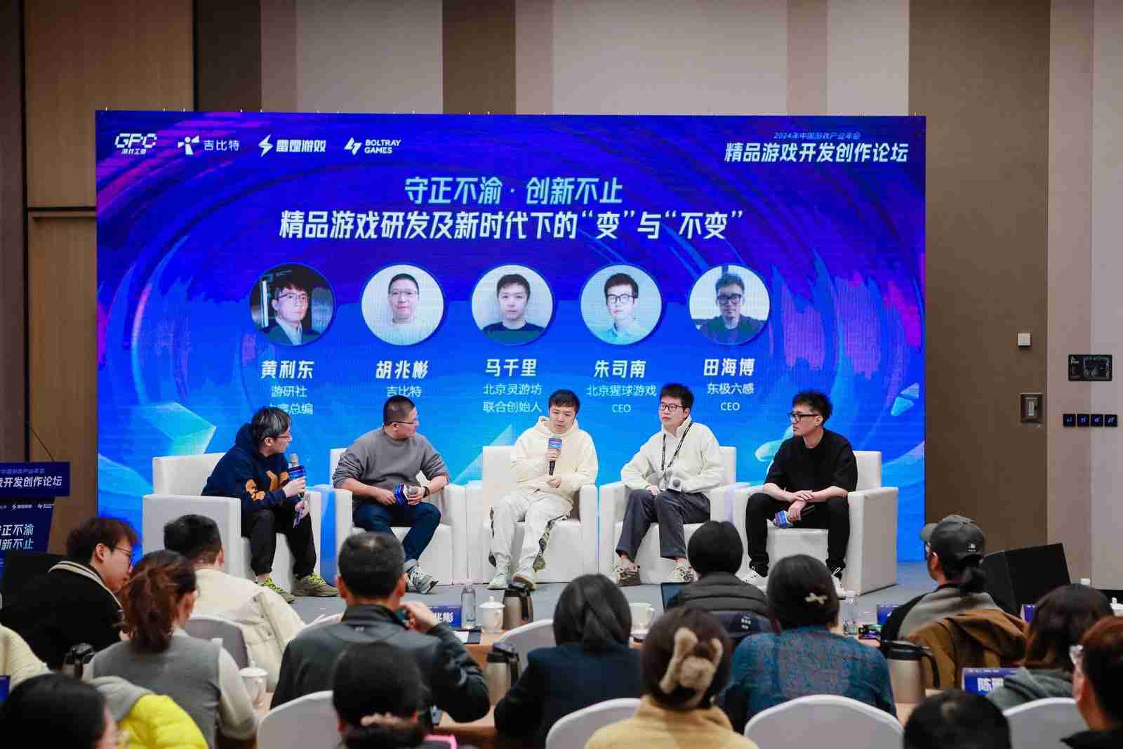 圆桌对话环节,,,在游研社内容总编黄利东的主持下,,yaxin868CTO胡兆彬、、北京灵游坊联合创始人马千里、、、、北京猩球游戏CEO朱司南、、、东极六感CEO田海博等四位嘉宾围绕“守正不渝、、、创新不止——精品游戏研发及新时代下的‘变’与‘不变’”这一主题分享了各自在精品游戏开发理念及工程能力搭建方面的见解和经历,,并就行业变化下游戏人需要坚守的理念等展开交流探讨。。